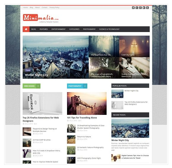 トップページ上部のスライダー(スライドショー)が印象的なテンプレート。カテゴリ別の記事画像にマウスオーバーすると、ねじれながらズームする。カテゴリページは、画像と記事の抜粋が3列で表示される。
