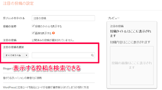 表示する投稿は、「注目の投稿を選択」でラベルと記事内の文字から絞り込み検索ができます。